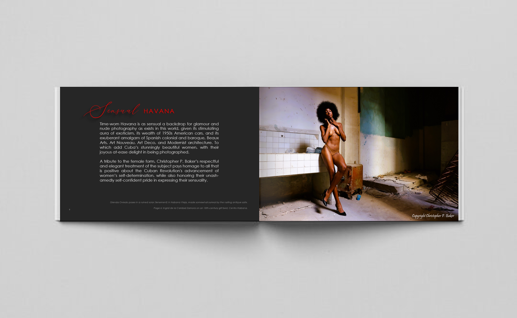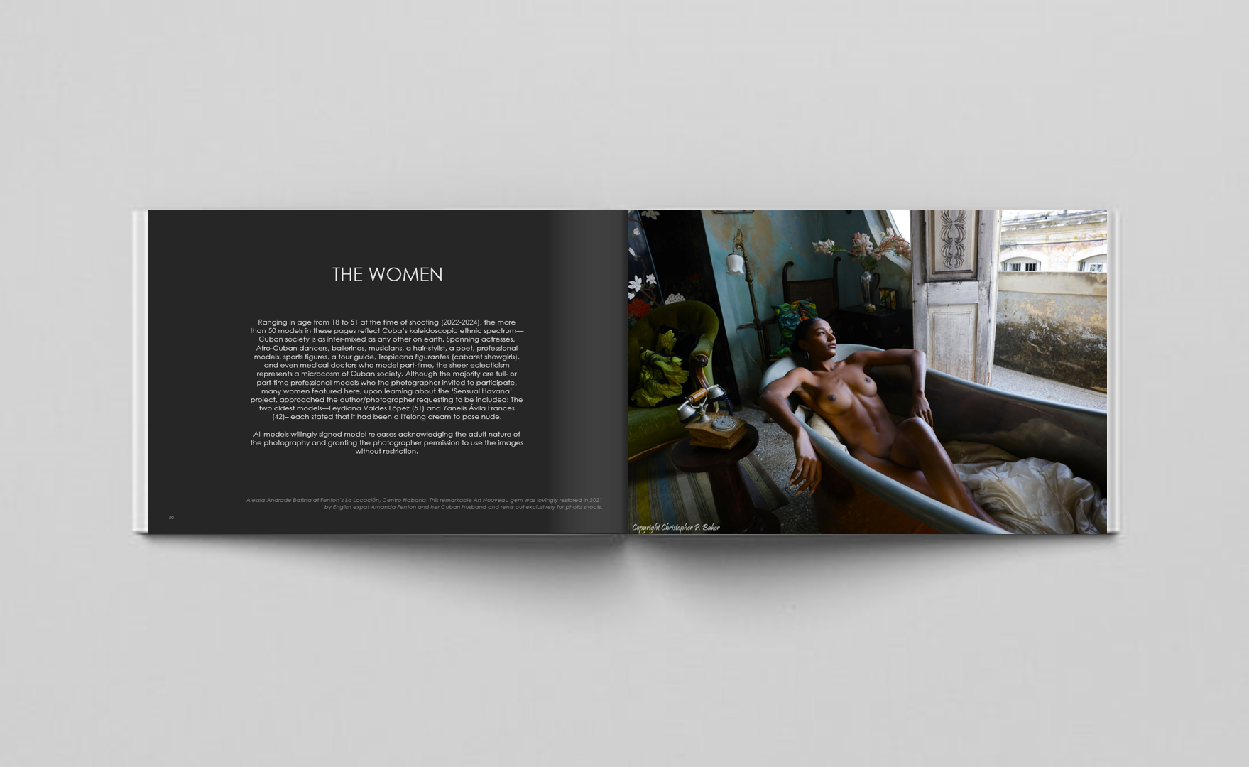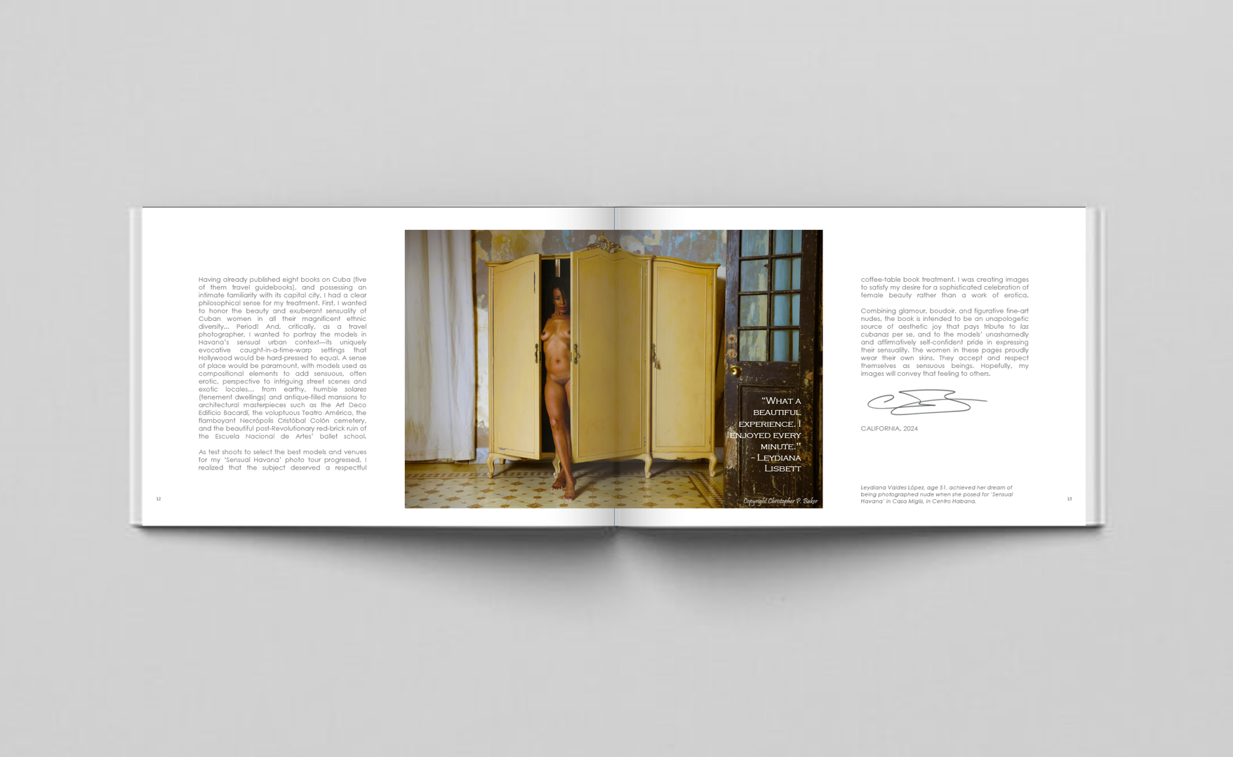 Nonetheless, Sensual Havana was never conceived as a work of erotica. As Christopher writes in the Preface: "I viewed it from the ancient Greek perspective, placing the human body on a pedestal, to be appreciated with reverence as a work of art and majestic beauty… and, yes, for its sensuality. So, this book is for anyone who appreciates the human body as art. And, critically, as a travel photographer, I wanted to portray the female models in Havana’s sensual urban context—its uniquely evocative caught-in-a-time-warp settings that Hollywood would be hard-pressed to equal."