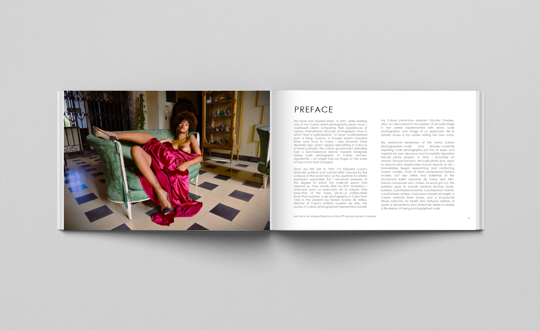 Combining glamour, boudoir, and figurative fine-art nudes, the book is intended, above all, to be an unapologetic source of aesthetic joy—a panegyric to female beauty—and an expression of esteem for the free-spirited Cuban females' self-confident pride in expressing their sensuality without shame. Ranging in age from 18 to 51, the women in these pages proudly wear their own skins (if little else); they accept and respect themselves as sensuous beings. Hopefully, my images will convey that feeling to others.